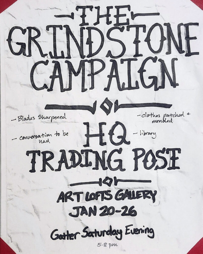 The Grindstone Campaign Headquarters and Trading Post is a hub for community building, bartering, education, and safety. Browse our curated library, learn about the campaign’s divisions, and trade services. Community meals are Saturdays, 5 to 8pm, with the next gathering on January 24th. Bring food to share and receive craft goods in return.