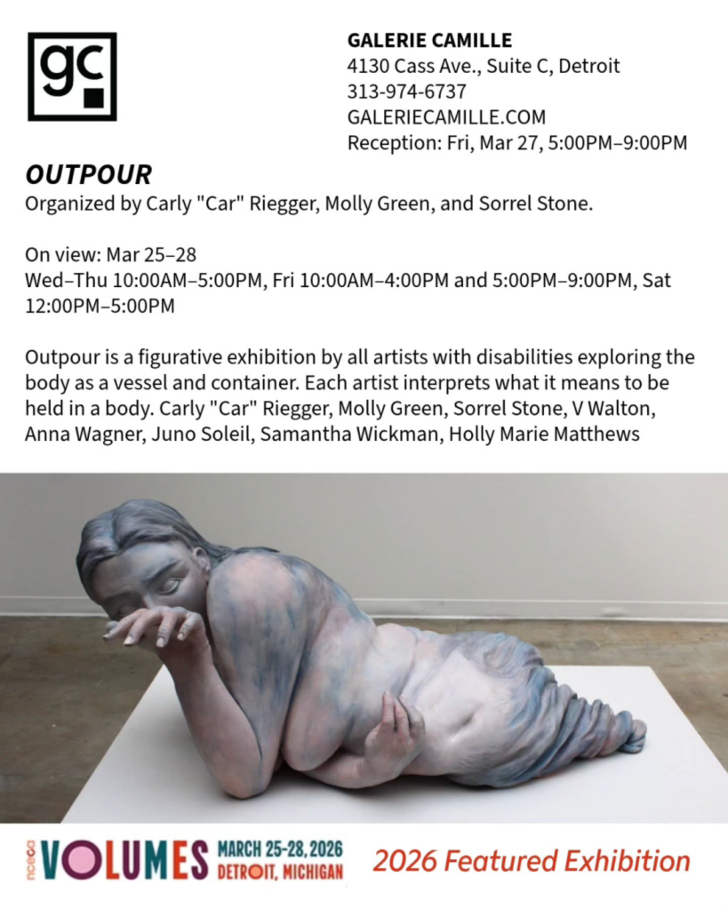 Outpour is a figurative exhibition by all artists with disabilities exploring the body as a vessel and container. Each artist interprets what it means to be held in a body. Organized by Carly “Car” Riegger, Molly Green, and Sorrel Stone.