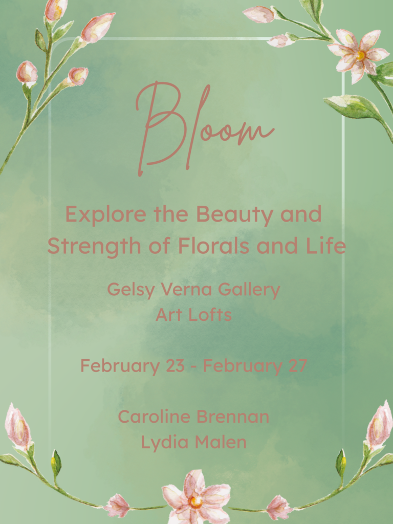 Explore the undergraduate pop-up exhibit Bloom: Explore the Beauty and Strength of Florals and Life by Lydia Malen and Caroline Brennan at the Gelsy Verna Gallery in the Art Lofts. This collection of floral paintings, clothing, and household items invites the viewers to interact with florals in a range of sentiments, surveying a range of flowers, how they manifest in the most meaningful parts of our lives, and the power they hold for each and every one of us.