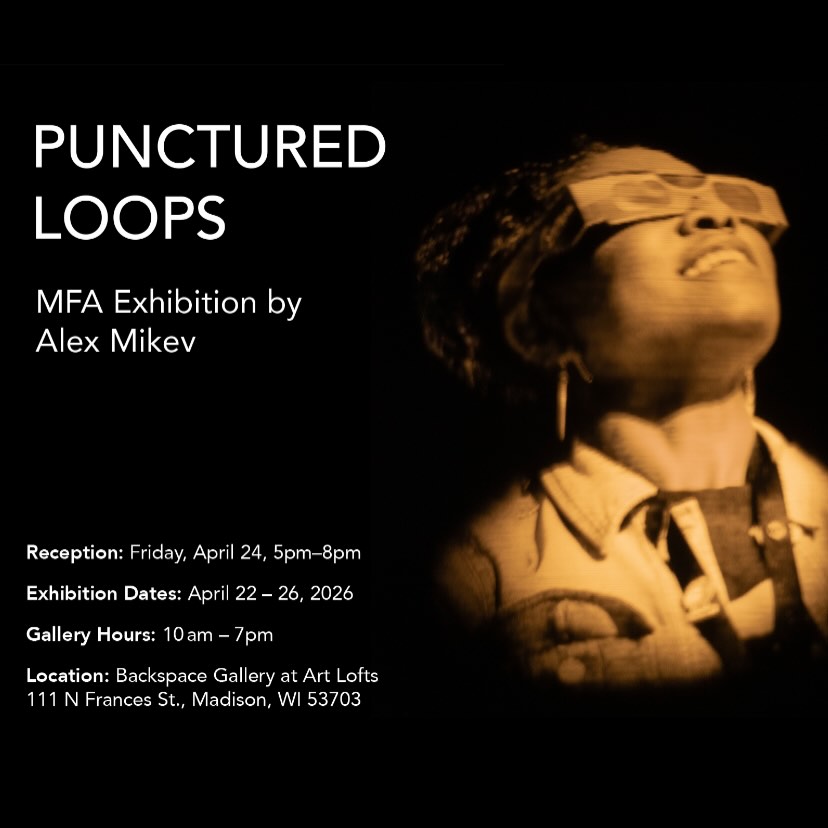 The Master of Fine Arts Thesis Exhibitions season continues with Alex Mikev’s exhibit Punctured Loops. The MFA Thesis Exhibitions mark the culmination of a three-year degree program that emphasizes development of a rigorous studio art practice under the supervision of a faculty guidance committee. Exploring an interdisciplinary approach to art making, as well as coursework in art history and related fields, artists cultivate professional practices that facilitate a sustainable career in the arts. Join us in celebrating our Class of 2026 UW-Madison Graduate professionals!