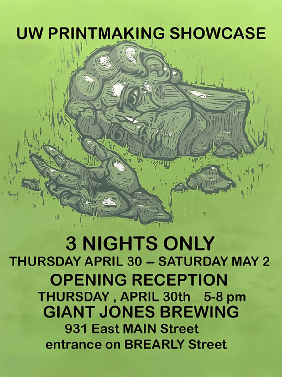 Join us for another night featuring UW Printmakers. We’ll have this year’s graduate’s art on our walls for all to see. You can come, grab a beverage and check out the art. And if you want, you can buy something for your walls!
